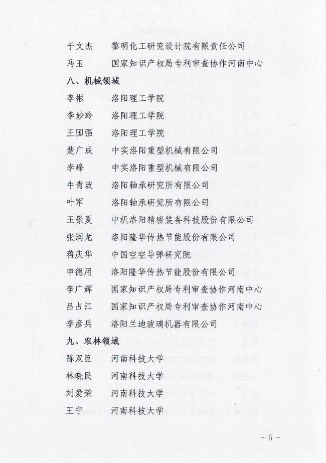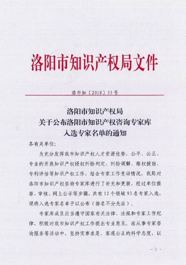根據(jù)洛陽市知識產(chǎn)權(quán)局于2018年12月3日發(fā)布的《洛陽市知識產(chǎn)權(quán)局關(guān)于公布洛陽市知識產(chǎn)權(quán)咨詢專家?guī)烊脒x專家名單的通知》(洛市知【2018】33號),中機(jī)洛陽精密裝備科技股份有限公司總經(jīng)理王景夏先生,入選為專家?guī)斐蓡T。